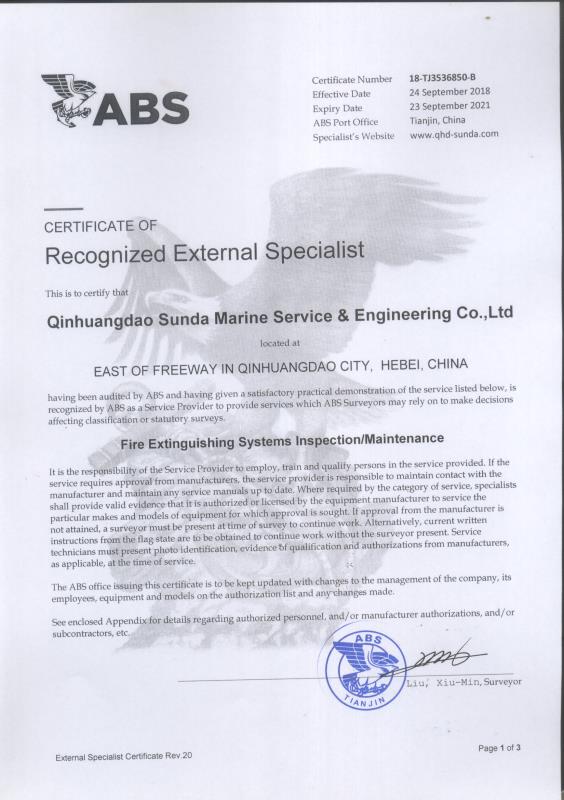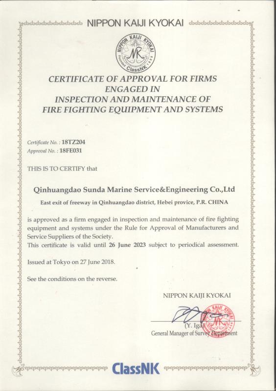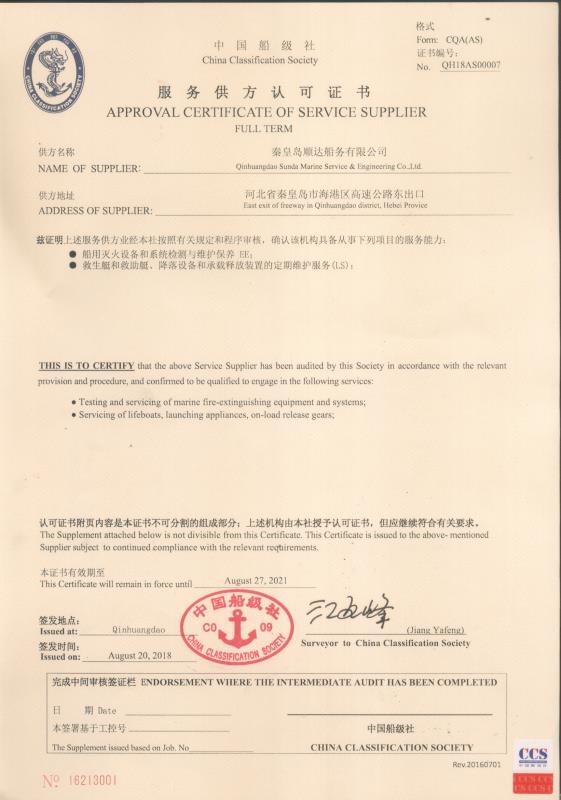 秦皇島順達船務有限公司位于美麗的海濱城市、中國北方著名的能源輸出大港--秦皇島。公司從事于船舶修理、物料供應、水下檢測、船體測厚、消防救生設備及救生艇檢驗、電氣自動化修理等服務。 公司自1997年成立至今,先后為國內(nèi)外船東修理、檢驗各類船舶萬余艘,積累了豐富的施工經(jīng)驗。公司現(xiàn)有場地100余畝,員工30余人,以及工程用車若干臺。我們公司一直本著嚴以律己、真誠待人、精益求精、信譽至上的經(jīng)營理念,以優(yōu)質(zhì)的服務、專業(yè)的施工、合理的收費,得到了國內(nèi)外船東的廣泛認可,贏得了良好的口碑和信譽。 公司已取得了中國船級社(CCS)、美國船級社(ABS)、日本船級社(NK)、德國船級社(DNV GL)等各個船級社的消防救生和救生艇檢驗資質(zhì), ...